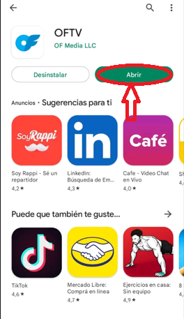 Luego de haber descargado la aplicación en el dispositivo móvil, lo único que nos queda por hacer es ejecutarla. Dentro de la misma sección de Google Play Store que nos figure cuando haya concluido la descarga podremos visualizar un botón que dice Abrir, y se encuentra resaltado en color verde. Allí hay que presionar para ingresar a la app, donde encontraremos todas las opciones disponibles. Tendremos la posibilidad de acceder a la suscripción que ya tenemos creada, o en caso de que no la tengamos podemos directamente generar la cuenta desde la app para luego aprovechar todos los beneficios que nos ofrece OFTV.