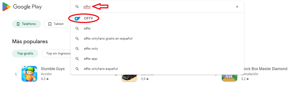 Si bien en el paso 1 les dejamos los enlaces para que haciendo click se puedan dirigir directamente hacia la aplicación dentro de la tienda correspondiente, si ingresamos desde otro sitio tenemos que buscar la aplicación para encontrarla y poder instalarla. Por eso, lo que tenemos que hacer es escribir las siglas «OFTV» en el buscador, y la primera opción que aparece es la que debemos seleccionar.