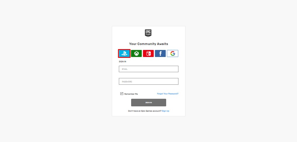 Para loguearte en Epic Games mediante tu cuenta de Play Station Network, solo tienes que seleccionar el logo de esta plataforma en la página de ingreso de esta web.