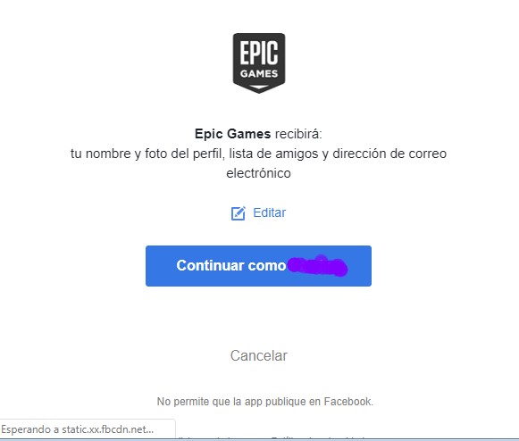 Una vez realizado lo anterior, aparecerá una pestaña emergente de Facebook, en la cual te explicará todos los permisos que tendrás que dar Epic Games para iniciar sesión. Si estás de acuerdo con ellos, haz clic en “continuar como”.