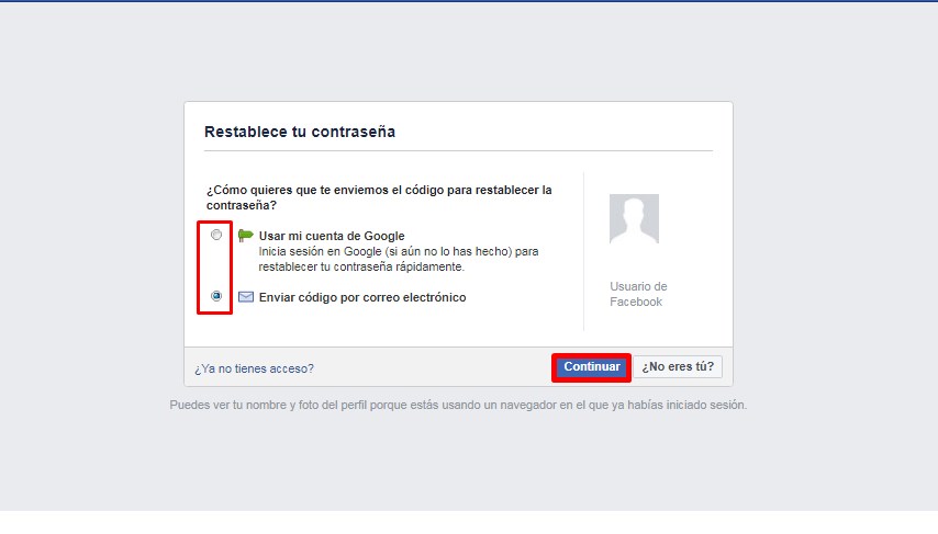 Facebook te dará opciones para enviar un código de verificación y así confirmar que eres el dueño de la cuenta a la que intentas ingresar, escoge el método y espera el mensaje.