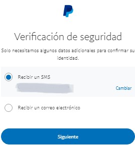 Por último, Paypal te pedirá que confirmes el otro método de verificación que no habías elegido, debido a que te enviarán un último código de verificación por esa vía que deberás añadir al espacio señalado. Una vez lo tengas presiona el botón siguiente.