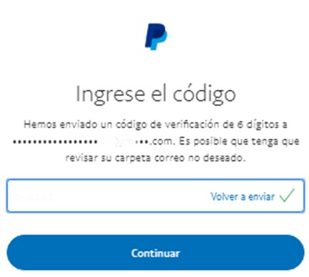 Habiendo recibido el código de verificación, este debe ser pegado en el espacio que Paypal indica para ello en la ventana que corresponde a este paso, tras hacerlo debes dar click en continuar.