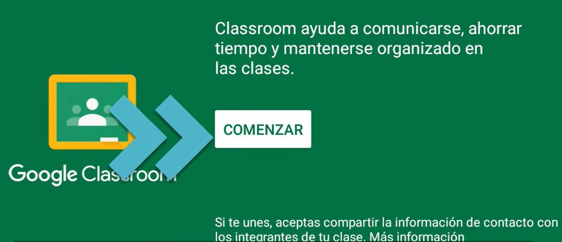 Cuando tengamos la app descargada en nuestro dispositivo tenemos que dar click en el botón Abrir. Una vez que lo hayamos hecho ya estaremos dentro, ya sea de la aplicación, o del sitio web en caso de que estemos haciéndolo en una computadora. Aquí nos aparecerá una pantalla verde de Google Classroom, y tenemos que tocar el botón «Comenzar» para dar inicio a la creación de la cuenta y de esta forma estar más cerca de poder unirnos a una clase (o crear una en caso de que seamos profesores).