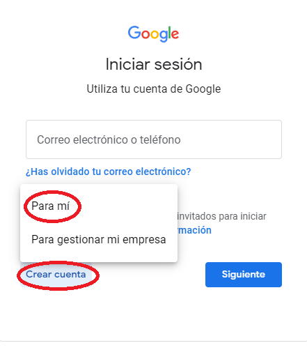 La siguiente pantalla que nos aparecerá será para completar algunos campos, y la primera opción que nos da es para que seleccionemos la cuenta de Gmail que estará asociada a la cuenta de Classroom. Tienen la posibilidad de seleccionar alguna si es que ya tienen creada y el proceso será mucho más sencillo, pero vamos a hacer la explicación pensando que no todos tienen una cuenta de Gmail. Lo que debemos hacer en ese caso es tildar la opción «Agregar cuenta». Luego directamente nos llevará a la pantalla de Gmail para que accedamos, pero tenemos que seleccionar el botón «Crear cuenta» y nos aparecerán dos opciones: Para mí o Para gestionar mi empresa, y por lo general se selecciona la primera mencionada (salvo que realmente queramos utilizarla para hacer gestiones).