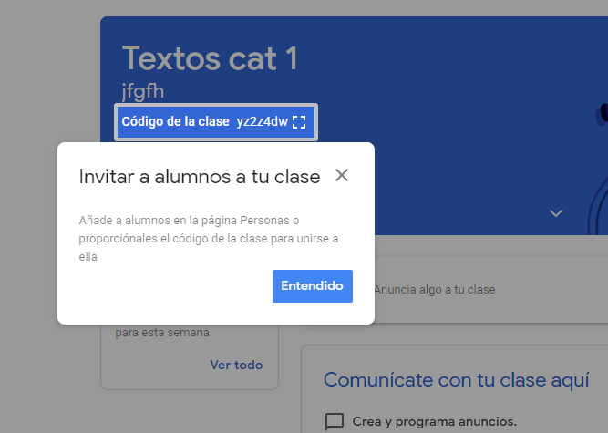 Lo siguiente es colocar algunos campos como el nombre de la clase, la sección, la materia y el aula. Una vez que lo hayamos hecho la aplicación nos dará un código que debemos compartir con los alumnos para que se unan y poder estar 100% conectados.
