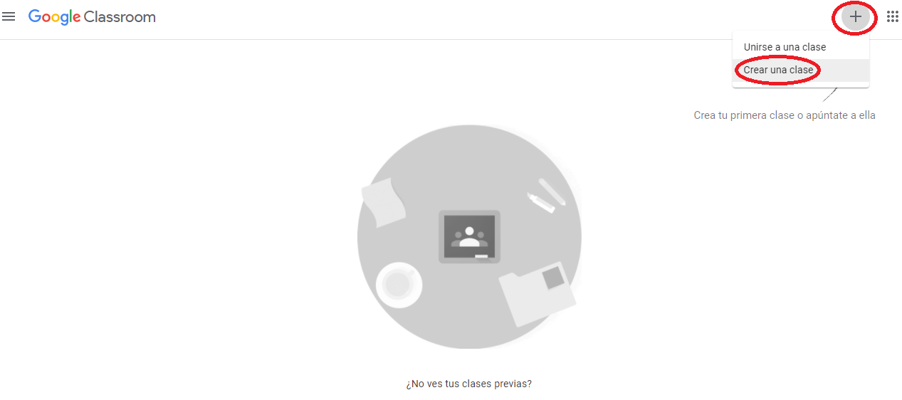 Si somos docentes y queremos crear una nueva clase para que se unan los alumnos la forma es muy sencilla. Una vez que estemos adentro de la cuenta, tenemos que ir al botón + que se encuentra en el extremo superior derecho de la pantalla, tildarlo, y seleccionar la opción Crear una clase.