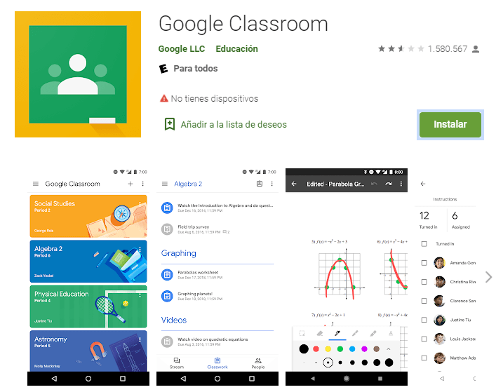 La aclaración del paréntesis en el título del paso 1 se debe a que esta herramienta se puede utilizar en las computadoras sin tener la necesidad de descargar la app, simplemente accediendo a este sitio web. Sin embargo también está la posibilidad de que puedan utilizarla en teléfonos celulares o tablets en caso de no contar con una computadora, o de simplemente encontrar estos dispositivos como más prácticos. Para hacerlo simplemente deberán ingresar a la tienda de Google Play Store, buscar «Classroom» y hacer click en «Instalar» para descargar la aplicación.