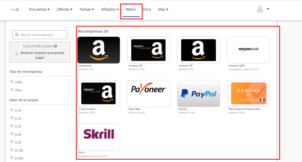El cobro mínimo de retiro depende del método de pago que elijas. Por ejemplo, si eliges retirar dinero a través de Amazon, necesitarás un mínimo de $ 4 USD de créditos.