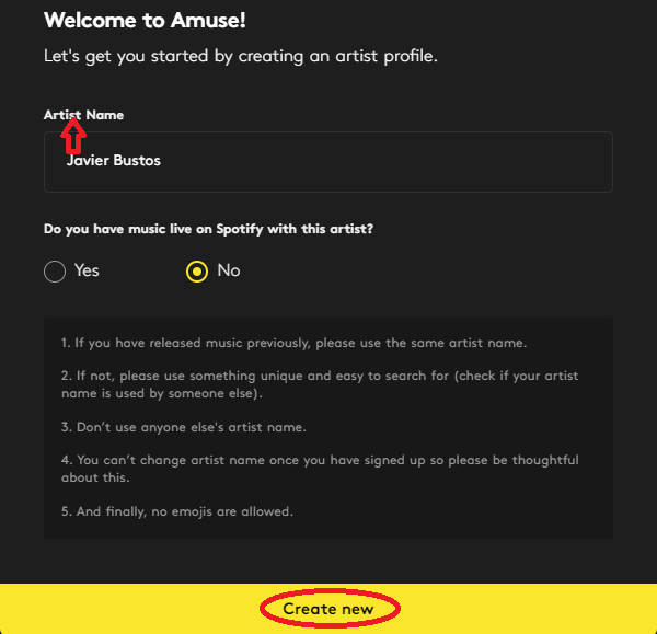 Este es un paso que hay que seguir solamente si somos artistas y queremos registrar nuestro contenido. Se trata de la posibilidad de crear un perfil de artista, simplemente colocando nuestro nombre artístico y detallando si ya tenemos registro en Spotify. Por último debemos tocar el botón que dice Create New y seguir.