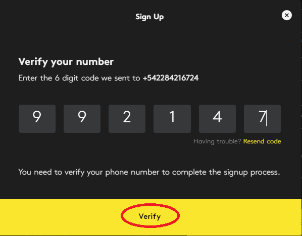 Una vez que hayamos culminado el paso 3, la propia plataforma nos enviará un mensaje de texto al número de teléfono que hayamos registrado, con un código de 6 dígitos que sirve para verificar nuestra identidad y confirmar la cuenta. Este código debemos completarlo en la siguiente pantalla que nos aparece dentro de la web, que tiene justamente 6 espacios en blanco. Cuando lo completemos solamente nos quedará hacer click en el botón amarillo que dice Verify, y podremos pasar a la siguiente instancia.