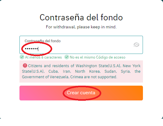 Este paso puede ser confuso porque ya colocamos una contraseña en el paso previo, pero en este caso se trata específicamente de la contraseña del fondo, que no es la misma que la clave de acceso. Solamente se nos pedirá en casos especiales en los que haya que hacer acciones específicas muy importantes o en compras grandes. Por eso recomendamos anotarla en algún lado o recordarla bien, ya que sino podemos tener problemas en estos casos. Tiene que tener como mínimo 6 caracteres y no cuenta con más restricciones. Cuando la tengamos definida y la hayamos escrito solo nos quedará presionar en el botón de Crear cuenta.