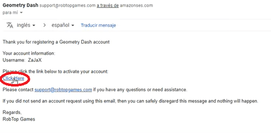Por eso lo que debemos hacer en esta instancia es dirigirnos hacia la bandeja de entrada de la casilla de correo con la que nos hayamos registrado, ingresar al mail que nos envió Geometry Dash y tocar el botón que dice Click Here para activar la suscripción.