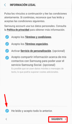 Uno de los puntos más importantes para la configuración de la cuenta dentro de un dispositivo es el de Aceptar los términos y condiciones del servicio que nos prestará la compañía. También se tienen que aceptar los términos especiales y activar el Servicio de profesionalización. Por eso luego de iniciar sesión se nos presenta la Información legal, y lo más sencillo de todo para finalizar es tildar la opción que dice He leído y acepto todo lo anterior. En este punto recomendamos realmente leer todos los términos, para comprobar que estamos de acuerdo y no llevarnos ninguna sorpresa a futuro. Cuando tengamos todo eso completo debemos tocar el botón que dice Siguiente ubicado abajo a la derecha, y de esta forma habremos finalizado la configuración.