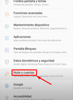 Lo primero que tenemos que hacer para configurar la cuenta en el dispositivo es dirigirnos hacia la sección de Ajustes o configuraciones. Una vez que estemos allí vamos a encontrarnos con muchas opciones, pero debemos ir hacia abajo del todo y presionar en el botón que dice Nube y cuentas, tal como se puede ver en la siguiente captura.