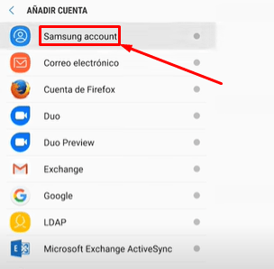 Luego de tocar en Añadir cuenta se nos pasará a otra pantalla, en la que se nos presentarán todas las opciones disponibles de cuentas para configurar (por ejemplo correo electrónico, Google, Duo, Exchange, entre muchas otras). La primera opción que suele aparecer dice Samsung account, y en esa debemos presionar para pasar a la siguiente instancia y estar más cerca de finalizar el proceso.