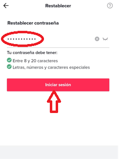 En el último paso que tenemos por realizar se nos presenta un campo que dice Restablecer contraseña. Esto se habilita únicamente cuando colocamos el código de verificación de identidad, y lo que nos pide es que ingresemos la nueva clave que queremos configurar. Hay que aclarar que no puede ser la misma que ya teníamos, y que si o si tiene que contar con una letra, un número y un símbolo especial (ya sea signo de admiración, de pregunta, comilla, etc). Además tiene que contar con entre 8 y 20 caracteres. Luego de haber escrito esta nueva clave simplemente debemos tocar en el botón rosa de Iniciar sesión. Automáticamente la contraseña se habrá cambiado y ya estaremos dentro de la cuenta para volver a disfrutar de todo el contenido de TikTok.