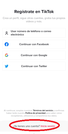 En la primer pantalla que nos aparece se nos deja todo preparado para registrarnos, ya sea con Facebook, Google, Twitter o con el correo electrónico. Sin embargo la opción que tenemos que tomar en esta vista es la que se encuentra abajo del todo, que dice ¿Ya tienes una cuenta? Inicia sesión. Los últimos dos términos que están resaltados en color rojo son en los que hay que presionar para seguir con el proceso.