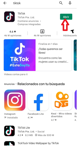 Muchas veces ocurre que no encontramos el logo en esta sección o por algún motivo nos resulta más sencillo ingresar desde la tienda, y esta es otra alternativa factible. Podemos acceder a la tienda, escribir TikTok en el search y seleccionar la primer opción que aparezca. Luego nos queda tocar el botón verde de Abrir para ingresar.