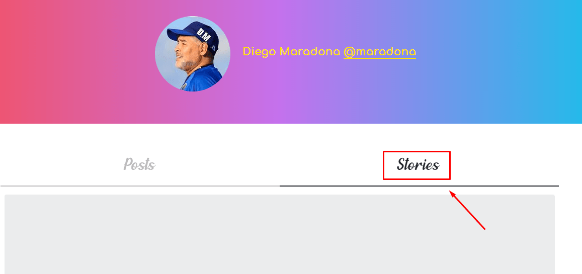 Cuando hayamos finalizado el paso 2 se nos presentará directamente el perfil de la persona que estamos buscando, con su foto de perfil y su respectivo nombre de usuario. Abajo de eso podremos visualizar dos secciones, de las que debemos elegir solamente una: Posts y Stories. La primera se refiere directamente al inicio o feed, y la segunda es la sección que estamos buscando: la de las historias. Por eso debemos presionar en esta segunda solapa, tal como se puede ver en la siguiente captura.
