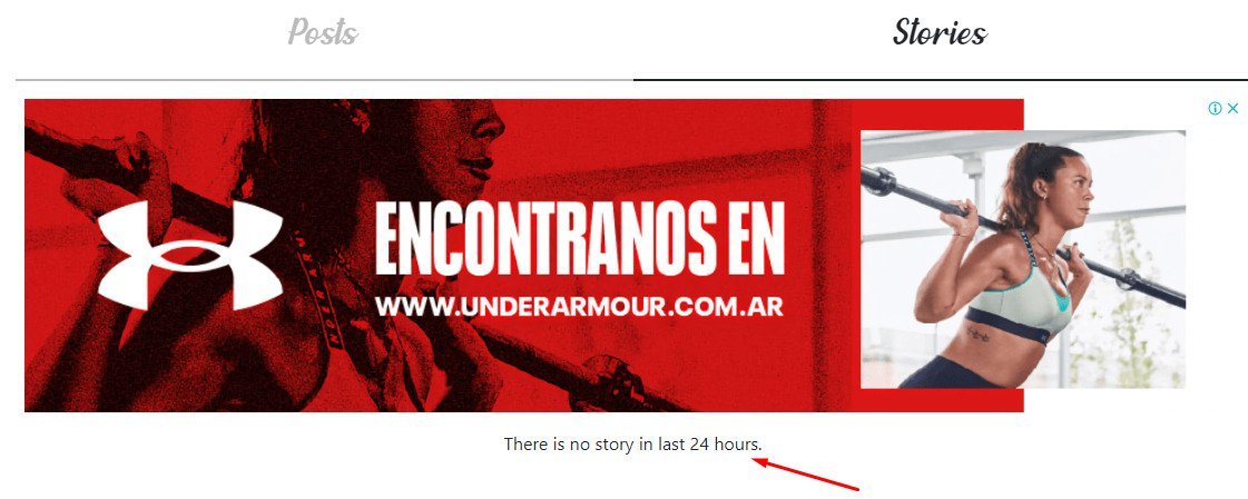 Otra cosa que nos puede pasar es que no se encuentren historias, y esto se debe a que esa cuenta no ha realizado publicaciones en modo historia en las últimas 24 horas. Aunque estemos queriendo verlas sin tener una cuenta, el límite temporal sigue existiendo y las historias se borran del inicio luego de pasado un día entero del momento de la publicación. Si esto ocurre se podrá visualizar un cartel que dice There is no story in last 24 hours.